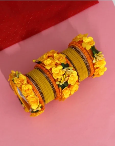 Women's Yellow Color Floral Bangles Set: 2.4 • Color: Yellow , • Fabric: Velvet• Type: Bangle, • Bangles Size: 2.4• Care Instruction: Avoid Heat & Chemicals Like Perfume, Deo, Alcohol, Etc. • After Use Clean With Dry Cotton Cloth.• Disclaimer: The color of actual product may vary slightly from the images provided due to photographic lighting conditions