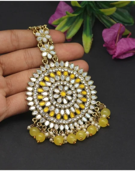 Women's Yellow Color Mirror Work Maang Tikka • Color: Yellow , • Metal: Alloy • Type: Maang Tikka, • Maang Tikka Length: 16.00 CM x Width: 6.00 CM • Care Instruction: Avoid Heat & Chemicals Like Perfume, Deo, Alcohol, Etc. • After Use Clean With Dry Cotton Cloth.• Disclaimer: The color of actual product may vary slightly