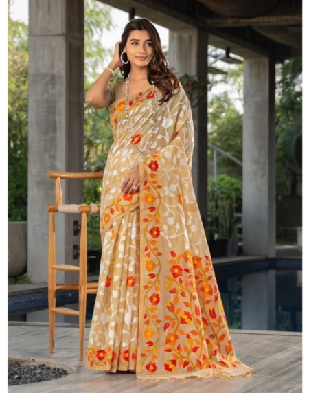 Generic Women's Cotton Printed Saree With Unstitched Blouse (Beige, 5-6 Mtrs)