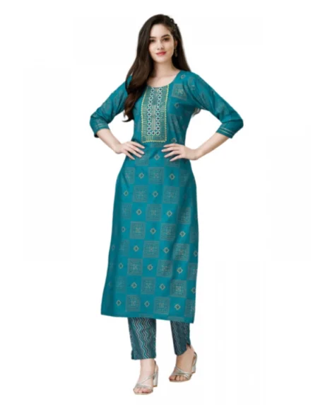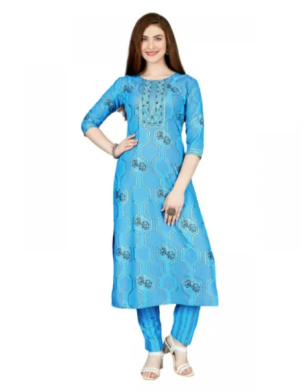 Women's Casual 3-4 th Sleeve Embroidery Rayon Kurti Pant Set• Color: Light Blue, • Material: Rayon• Pattern: Embroidery, • Type: Kurti Pant Set, • Length Type: Below Knee• Neck Type: Round Neck, • Sleeve Length: 3/4 th Sleeve, • Gender: Women• Disclaimer: The color of actual product may vary slightly from the images provided