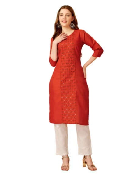 Women's Casual 3-4 th Sleeve Embroidery Rayon Kurti Pant Set• Color: Orange, • Material: Rayon• Pattern: Embroidery, • Type: Kurti Pant Set, • Length Type: Below Knee• Neck Type: Round Neck, • Sleeve Length: 3/4 th Sleeve, • Gender: Women• Disclaimer: The color of actual product may vary slightly from the images provided due