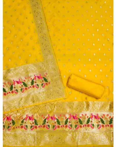 Women's Banarasi Silk Printed Unstitched Salwar Suit Material With DupattaColor: Yellow, Material: Banarasi Silk Pattern: Printed, Top Fabric Length: 3MtrsBottom Fabric Length: 2.50Mtrs, Dupatta length: 2.30MtrsDisclaimer: The color of actual product may vary slightly from the images provided due to photographic lighting conditions and difference in screen resolutions.