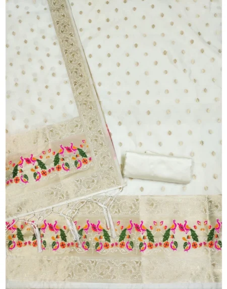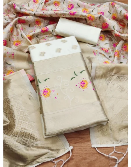 Women's Banarasi Silk Printed Unstitched Salwar Suit Material With DupattaColor: White, Material: Banarasi Silk Pattern: Printed, Top Fabric Length: 3MtrsBottom Fabric Length: 2.50Mtrs, Dupatta length: 2.30MtrsDisclaimer: The color of actual product may vary slightly from the images provided due to photographic lighting conditions and difference in screen resolutions.